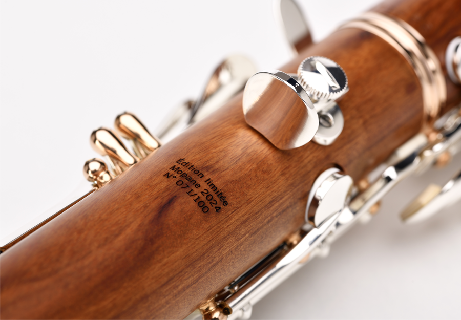 This Limited Edition Mopane instrument takes up the characteristics of the new Festival clarinet in grenadilla presented last spring, sporting the famous “Grand Siècle” finishings that are standard on the Légende model. The low F correction key, found on the Divine, Légende and Tosca models, is also added to the lower joint.
