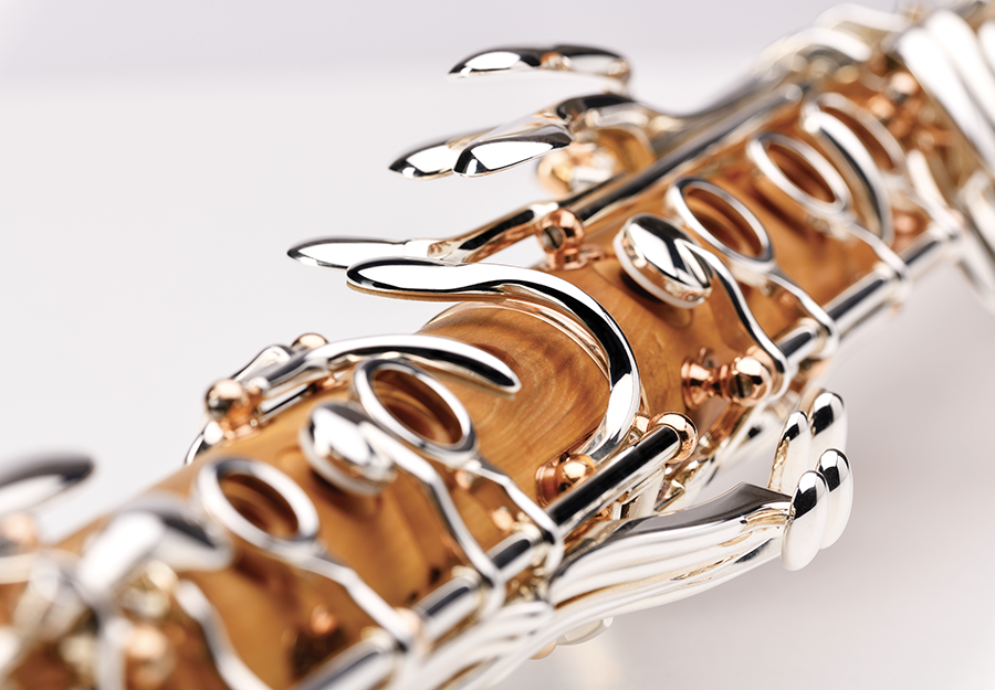 Stellen Sie sich vor: Das um einige Zentimeter verlängerte Unterstück einer B-Klarinette, in dem ein geschickt platziertes Resonanzloch das tiefe E-flat mit einem vollen, kernigen Klang zum Schwingen bringt, und überhaupt das gesamte Chalumeau-Register dank seiner begrenzten Erweiterung zugunsten eines längeren Zylinders. Ein kürzerer Schallbecher, der nicht mehr die Präzision der Grundtöne E/H und F/C bestimmt, sondern als Resonator für die gesamte Klarinette dient. Ein überraschend stabiles und leichtes hohes Register, vor allem dank des verlängerten Unterstücks. Ein dritter B-flat-Griff in der Mitte, der die gesamte Bohrung des Instruments zum Schwingen bringt und so einen vollen, klaren Klang erzeugt. Dieser neue Mechanismus ermöglicht es dem Musiker, neue Sequenzen zu kreieren, ohne das Register zu wechseln oder bestimmte Fingersätze zu wiederholen, die in den Stücken des Repertoires verwendet werden.